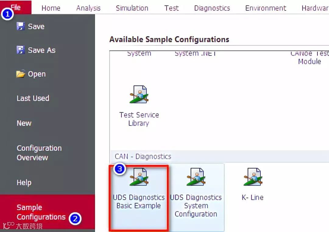 通过诊断工具链中的CANoe软件,按照路径File→Sample Configurations→CAN-Diagnostics选框下→UDS Diagnostics Basic Example打开Demo。