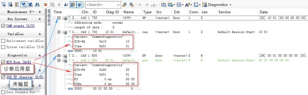 如勾选“ECU Door”则显示应用层诊断服务的解析信息,如ECU名称为Door,0x10是SID-RQ(服务ID)等,若勾选“ISO TP observer”则对应显示传输层的信息,如数据帧特征位【02】,数据长度len等。