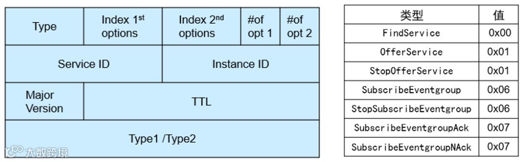 Entry分为两种类型:面向服务(Service)的Entry和面向事件组(Eventgroup)的Entry,两种类型的Entry都是16字节大小。对于面向服务的Entry,可分为发现服务(FindService)、提供服务(OfferService)和停止提供服务(StopOfferService);对于面向Eventgroup的Entry,可分为订阅事件组(SubscribeEventgroup)、肯定应答(SubscribeEventgroupAck)、否定应答(SubscribeEventgroupNAck)和停止订阅事件组(StopSubscribeEventgroup)。Entry字段格式和Type值如下图所示。