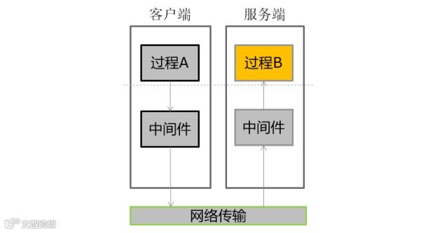 服务提供者作为服务端(Server),服务消费者作为客户端(Client),服务实现是借助于远程过程调用机制(RPC),客户端和服务端通过中间件进行信息的传输,而中间件是应用层软件和底层硬件之间的软件统称。