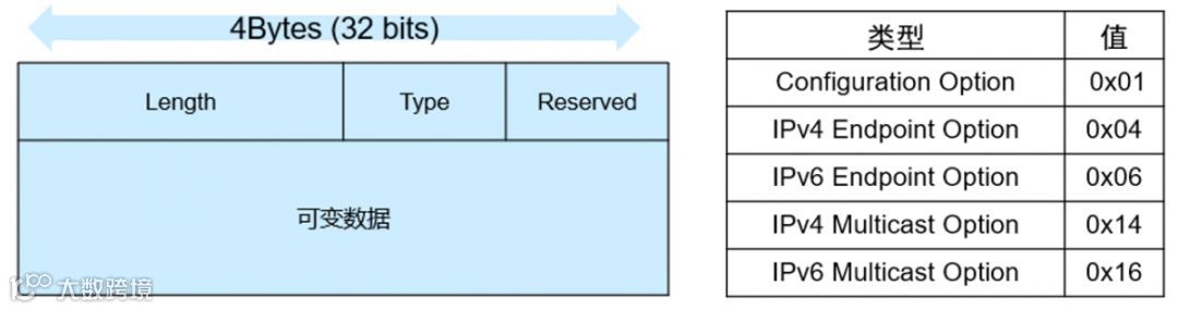 Configuration Option 包含的是字符串信息,可以用来表示主机名称、服务以及服务实例的名称等多种可以转化为字符串的信息;Endpoint Option又分为IPv4 Endpoint Option和IPv6 Endpoint Option,此类Option中会包含IP地址、传输协议(UDP或TCP)和服务端的端口号;Multicast Option分为IPv4 Multicast Option和IPv6 Multicast Option,此类Option中会包含组播IP地址、UDP协议以及组播端口号。每种类型的Option Type都有对应的Type值,Option字段格式和Type值如下图所示。