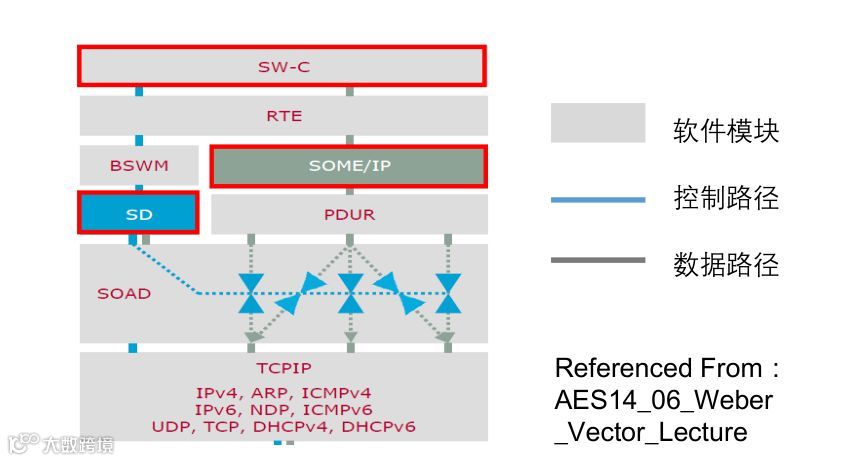 区别于传统CAN/LIN等总线面向信号(Signal-Oriented)的通信方式,SOME/IP用于面向服务(Service-Oriented)的通信,这也是以太网在汽车领域应用的最大优势所在。面向服务的通信传输是服务的相关信息,汽车以太网应用方面最重要的是面向服务的架构,简称为SOA(Service Oriented Architecture)。SOA的核心是服务,服务可以简单理解为是实现某种功能的函数或算法。至于面向服务通信与面向信号通信的具体区别,可查阅《面向服务通信与面向信号通信》。