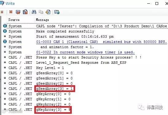 3)在CANoe中运行, demo用的是仿真模式,ECU响应也由CAPL模拟,按下a键则安全访问开始,如下: