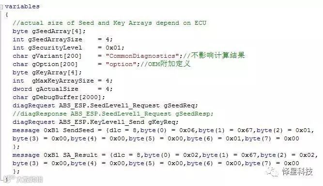 1)在CAPL的变量声明中先定义与安全访问相关的参数和诊断请求: