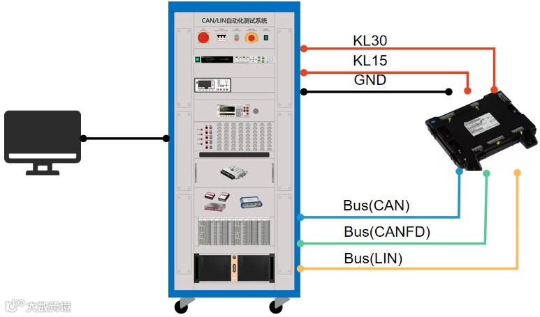 测试硬件系统:主要功能是模拟硬件测试环境,进行ECU电源控制、I/O信号控制及仿真、报文监控及仿真、总线故障注入、总线信号采集等。