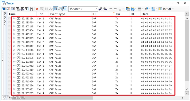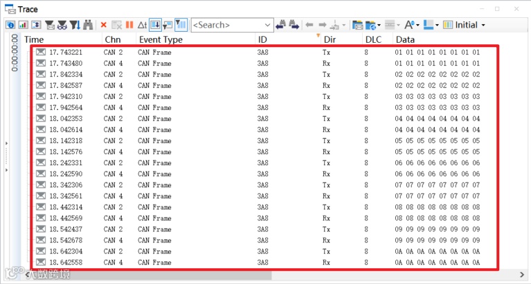 ■ Step2:根据路由表定义,选取其中一条周期路由报文,在源网段仿真发送源报文,报文ID为源报文ID,周期为源报文周期,DLC为源报文DLC,数据内容从0x01依次增加,持续发送10倍目标报文周期时间