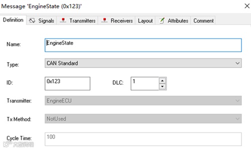 CANdb++ Editor左侧的浏览树中的Messages,右击->new,新建报文,这里以发动机报文EngineState为例: