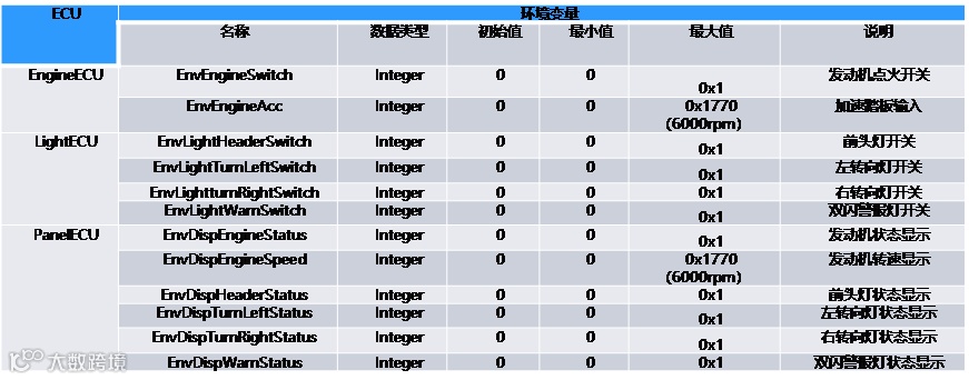 为了能够通过面板设计来实现控件操作报文信号的收发、模拟汽车传感器输入(发动机点火开关和加速踏板)、汽车执行器输出(车灯)和人机交互界面(仪表盘),需要定义以下环境变量,如表3所示。