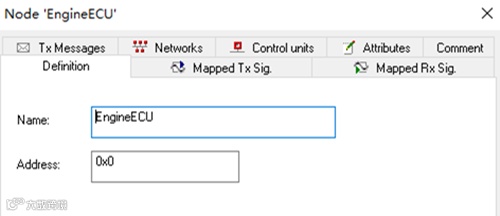 CANdb++ Editor左侧的浏览树中的Nodes,右击->new,新建节点,这里以发动机节点EngineECU为例: