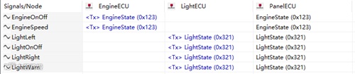 经过以上五个步骤,已经基本完成了数据库文件中元素的定义,可以通过View->Communication Matrix来查看节点之间报文和信号的收发关系(通信矩阵),如图16所示。