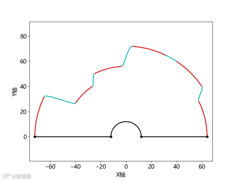 实践是检验真理的唯一标准,让我们用matplotlib绘制设计的模型,模拟效果如下图所示,红色为圆弧,蓝色为连接线: