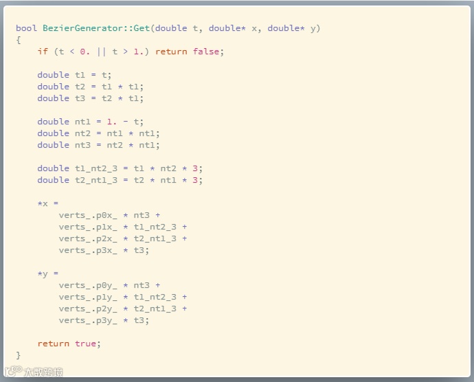 因为Kanzi并没有提供贝塞尔曲线的绘制工具,所以只能通过传入贝塞尔曲线的数据集进行绘制。使用前文中提到的三阶贝塞尔曲线公式,可以实现一个根据 t ∈ [0,1] ,获取贝塞尔曲线不同位置的点坐标的方法。