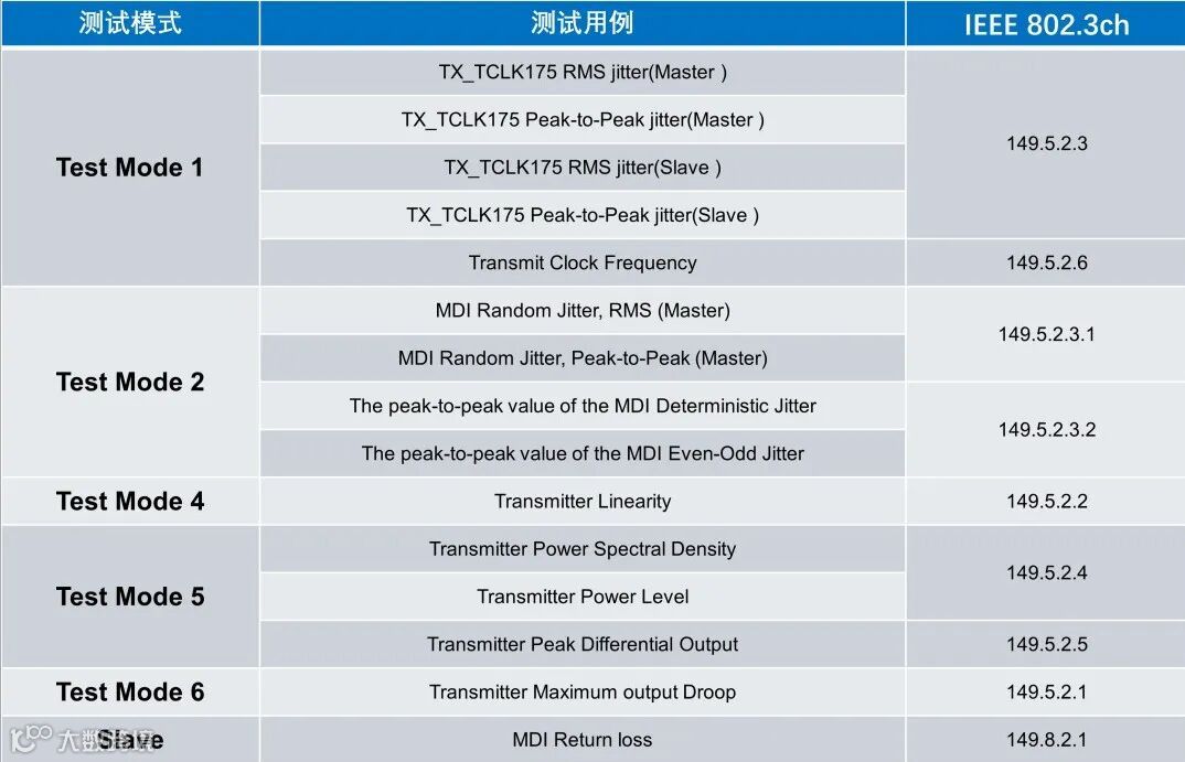 由于OPEN Alliance 还没有正式发布MiltiGBASE-T1的测试规范,目前我们参照IEEE 802.3ch-2020来进行测试。对比1000Base-T1,可以发现10GBase-T1的PMA测试加强了对时钟性能和信噪比的验证。测试之前,同样需要切换样件的测试模式,以验证不同的电气参数。接下来我们按照测试模式的排序,一起探索10GBase-T1PMA一致性测试。
