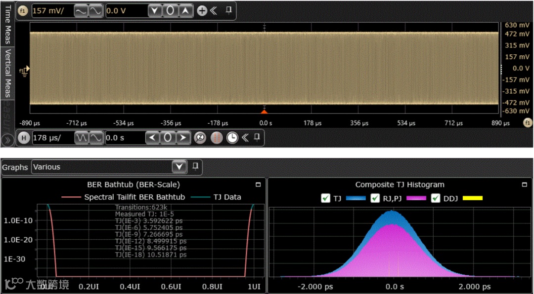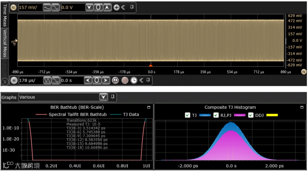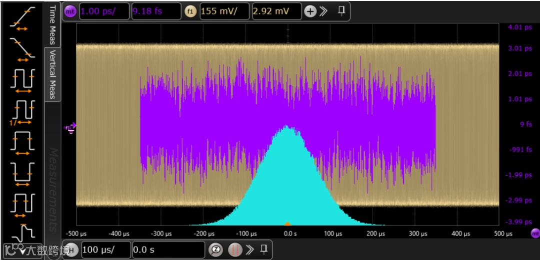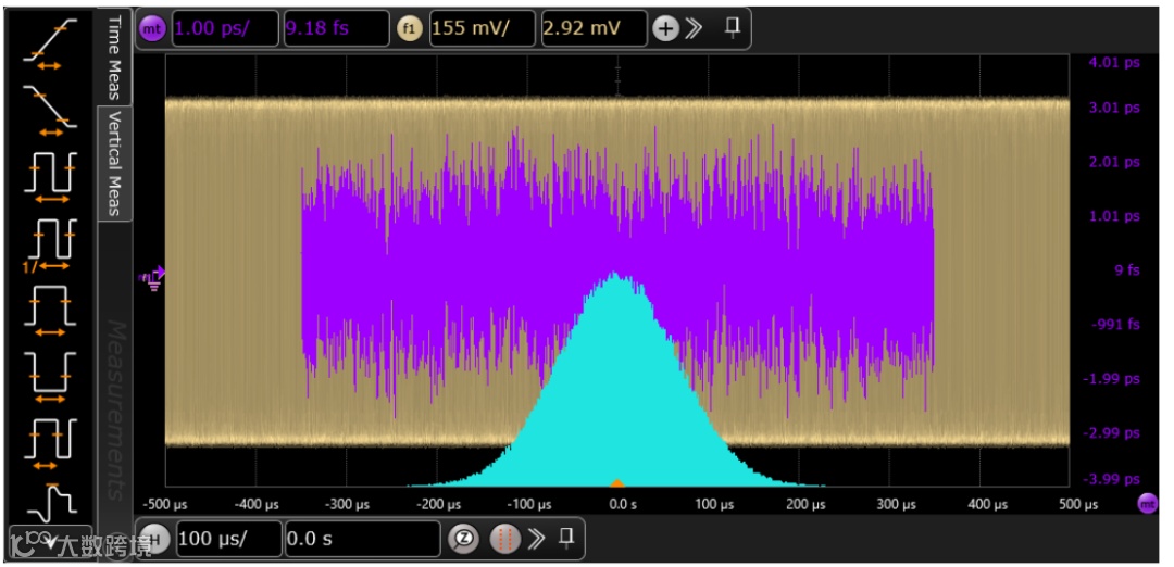 示波器通过测试夹具,捕获MDI接口的信号波形,然后与无抖动参考波形进行比较计算,得到抖动的RMS值和峰峰值。无抖动参考波形是示波器从MDI接口捕获的波形中基于产生最小时间间隔误差和相位的线性回归得到的恒定时钟频率。