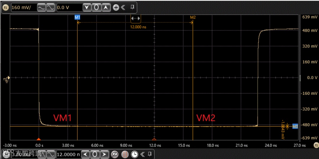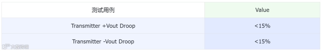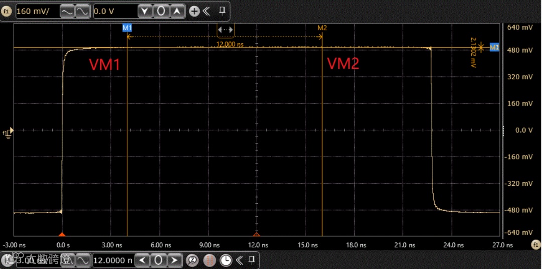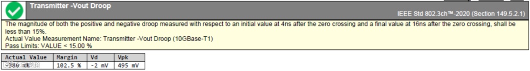 测试模式6,用于测量发射机电压跌落。此模式下,DUT中的PHY被配置为使用本地时钟源,连续发送128个{+1}符号和128个{-1}符号。示波器通过测试夹具捕获波形,分别测量过零后4ns的初始电压值VM1和过零后16ns的终点电压值VM2,并按照如下的公式进行计算: