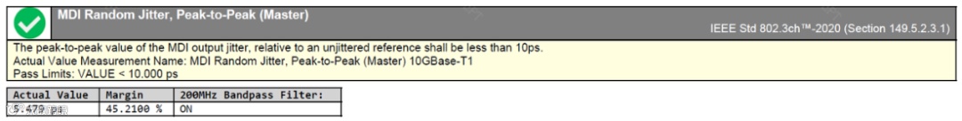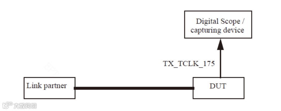 DUT需要与一个Link partner之间建立linkup连接,且保持在OK状态。示波器通过测试夹具,捕获MASTER和SLAVE模式下的TX_TCLK_175信号波形,可直接测得MASTER传输时钟频率,然后与无抖动参考波形进行比较计算,得到抖动的RMS值和峰峰值。无抖动参考波形是示波器从捕获的TX_TCLK_175波形中基于产生最小时间间隔误差和相位的线性回归得到的恒定时钟频率。