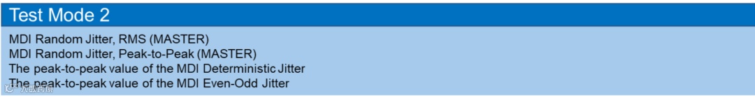 测试模式2,用于在MDI接口上测量MASTER传输时钟抖动。此模式下,DUT中的PHY被配置为使用本地时钟源,连续发送JP03A符号序列(详见IEEE 802.3 94.2.9.1 )或者JP03B(详见IEEE 802.3 94.2.9.2 )符号序列。