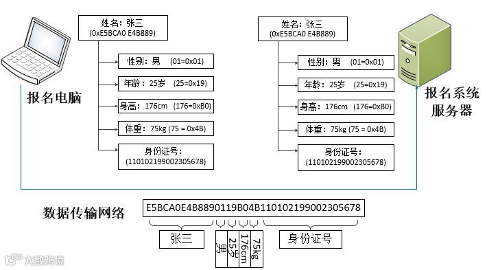 张三在网上报名参加北电艺考,要求填写的报名信息有: 性别、年龄、身高、体重、身份证号。张三在本地电脑填写完成后,这些信息通过序列化操作转换成二进制数据串,数据串通过网络传输到报名系统服务器,报名系统通过反序列化操作将二进制数据串还原成对象信息。