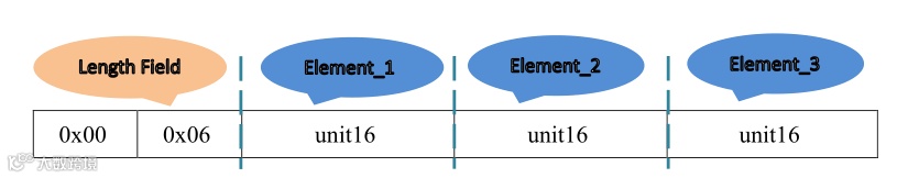 Example:设定Length Field为2bytes,一维数组由3个元素(unit16类型)构成,序列化的过程见下图。