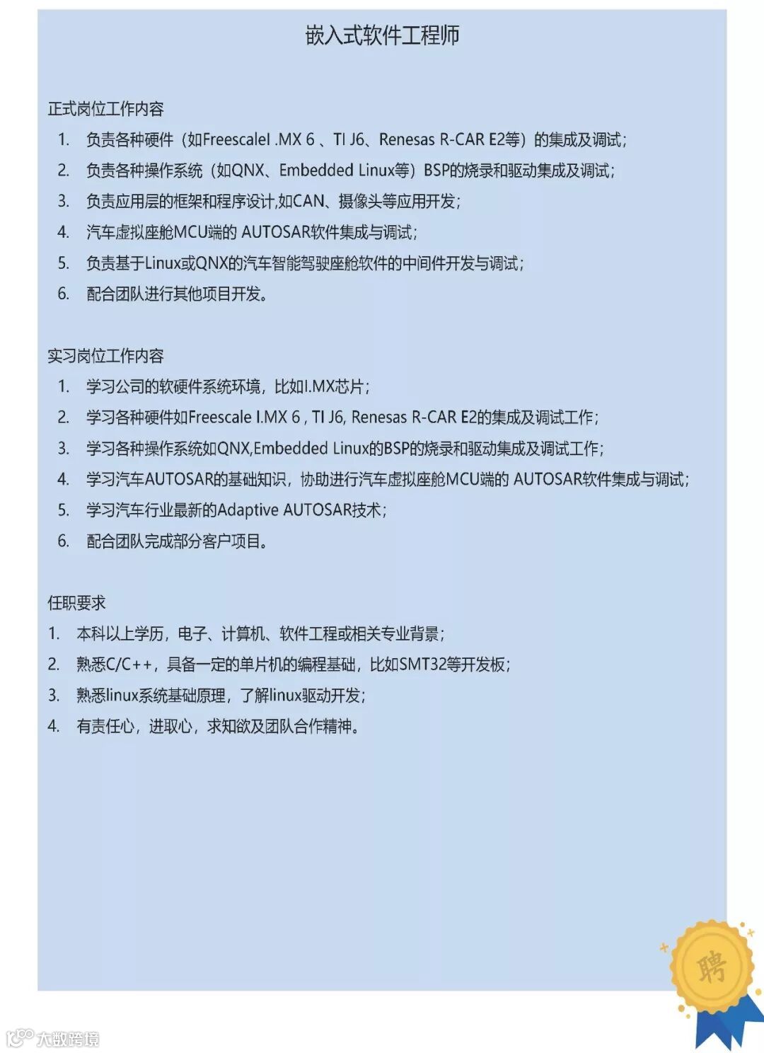 公司核心层平均具有10年以上的汽车电子行业经验,骨干员工多数来自泛亚、长安、标致雪铁龙、观致、大陆、博泰、恒润等国内知名的整车厂或零部件企业,80%以上的员工具备硕士及以上学历(清华、南开、北理工、同济等名校教育背景),不但具备丰富的工程经验,也具备极高的成长潜力。