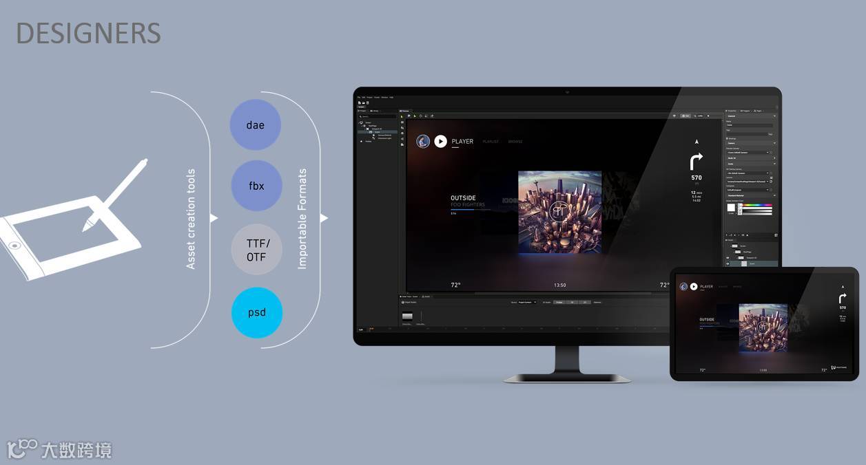 Kanzi Studio 是Windows上一款所见即所得的面向设计的HMI设计工具,可以支持设计师常用的设计工具,如PhotoShop,3D Max, After Effects 等等常见的3D和2D的设计工具。基于Kanzi,设计师可以快速的设计出符合自己想法的HMI用户界面,制作出具有设计感的用户界面,包括UI静态效果,动画,交互设计等等。设计师通过Kanzi Studio设计的HMI效果可以在后期被软件工程师直接用于目标平台进行量产项目开发,从设计到目标平台无缝集成。