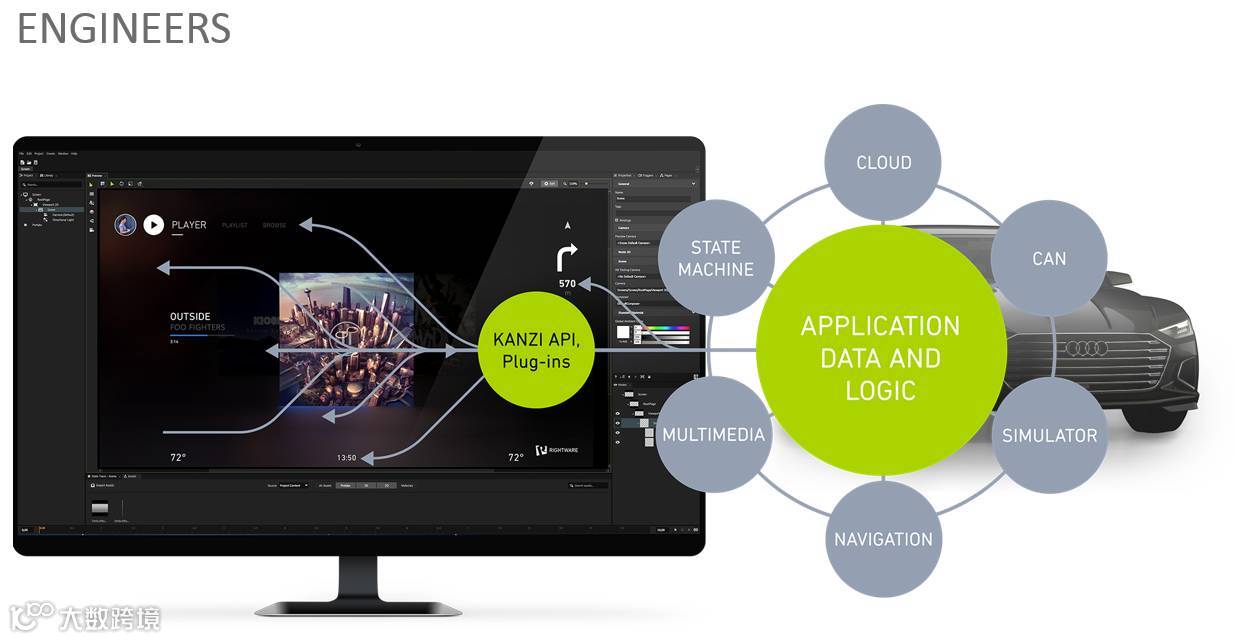 Kanzi 为软件工程师提供了跨平台的C++开发框架支持,Kanzi支持的数据驱动开发模式,可以将各种业务逻辑开发成插件的形式,可视化地集成到工具中,与设计师设计的HMI界面进行轻松地集成,大大提升软件业务逻辑的开发效率。Kanzi 真正的做到了让设计师和软件开发人员各自专注在彼此擅长的领域,设计师专注HMI效果设计,软件开发人员专注业务逻辑数据插件的开发,基于Kanzi Studio 将HMI效果与业务逻辑进行轻松地集成,大大提升了生产力,也提升了软件产品的设计质量。