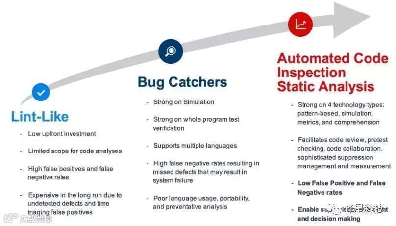 自动化静态分析尤其适用于大型和复杂的软件代码检测。它可以分析数百万行源代码,以确保复用代码和新增加代码符合既定标准。