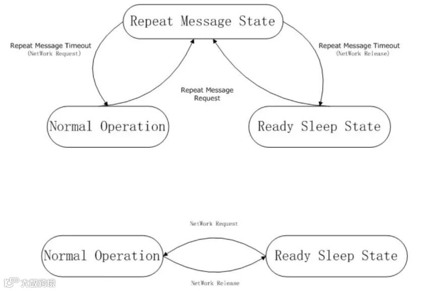 Repeat Message State重复报文状态,此时NM报文以快速周期发送。在重复报文状态中又存在两种子状态:快速发送报文状态(以一个快速周期,按照规定的快发次数发送NM报文)、正常发送报文状态(以正常发送周期发送NM报文)。