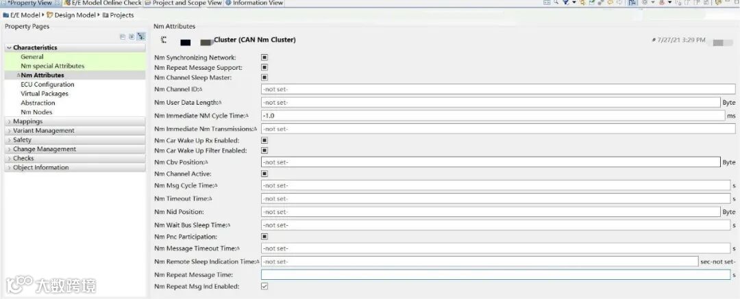 在CAN NM Cluster的Property页,可以配置NM所需要的一些关键属性,例如NM Timeout Time等,这些可配置的属性都是AUTOSAR NM中所定义好的。