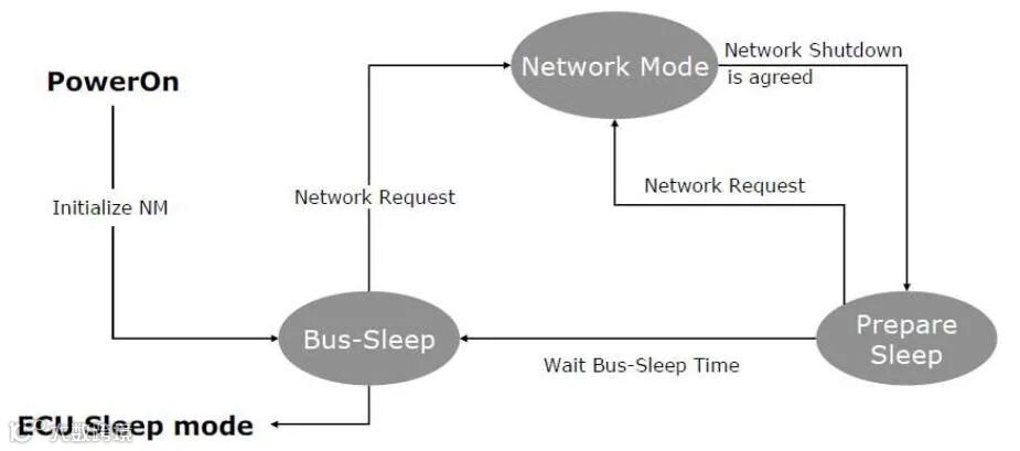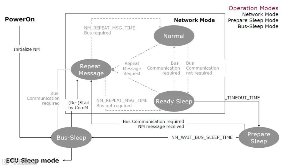 Bus Sleep Mode:睡眠模式,总线无通讯,ECU处于低功耗状态。该模式下NM报文只收不发,APP报文不收不发。