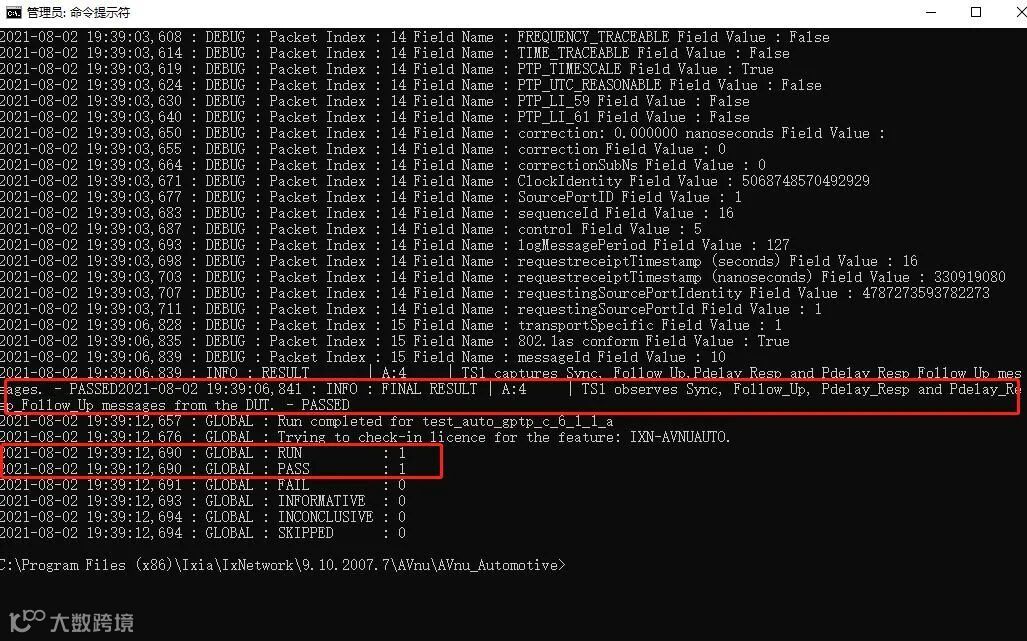 测试结束后,在CMD窗口会显示当前测试是否通过;同时会生成测试报告和log文件,存放在以本次测试开始时刻命名的文件夹内,存放的地址:C:\Program Files (x86)\Ixia\IxNetwork\9.10.2007.7\AVnu\AVnu_Automotive\userdata\logs。