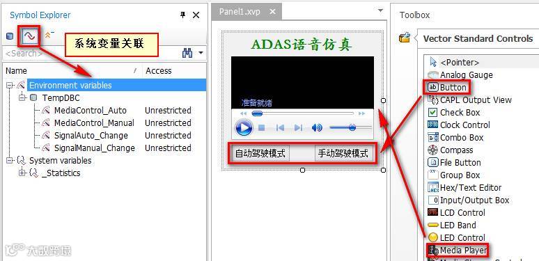 Step4:Panel面板设计,两个Button控件(关联SignalAuto_Change和SignalManual_Change这两个环境变量),用于模拟驾驶模式切换操作,两个MediaPlayer控件(加载对应音频文件,关联MediaControl_Auto和MediaControl_Manual这两个环境变量),用于控制音频输出;