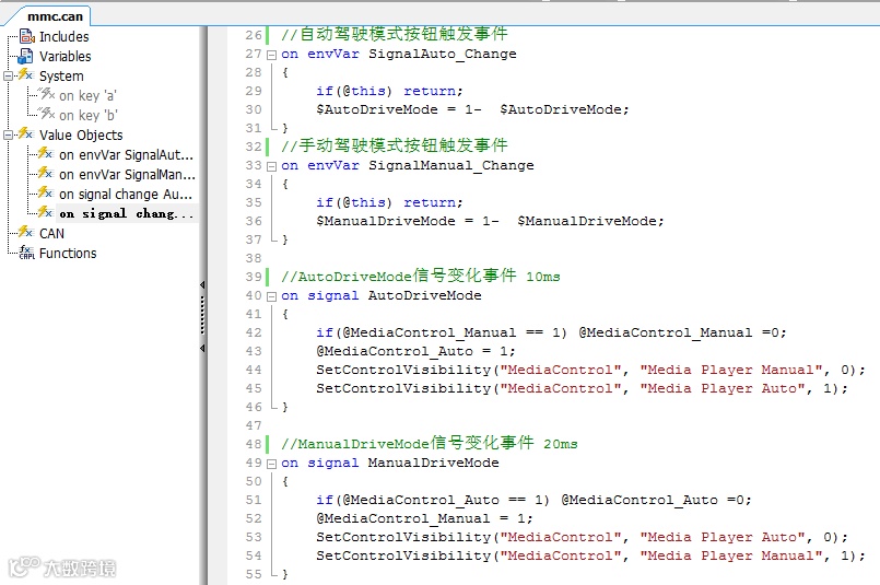 Step5:CAPL脚本编辑,都是基于事件的函数处理,在on envVar事件中,当相关控制按钮按下时(改变SignalAuto_Change和SignalManual_Change的值),对应信号取反(0-1或1-0),同时信号的变化触发音频数据的切换(改变MediaControl_Auto和MediaControl_Manual的值),这里在代码中进行了互锁的配置,保证两个音频播放时互不打扰,SetControlVisibility函数用于设置Media Player控件的可见性,大家注意观察面板,其实两个Media Player控件是重叠在一起的,需要哪个音频播放时,相应的MediaPlayer控件就会显示出来,另一个Media Player控件就会暂时不可见,互不干扰;