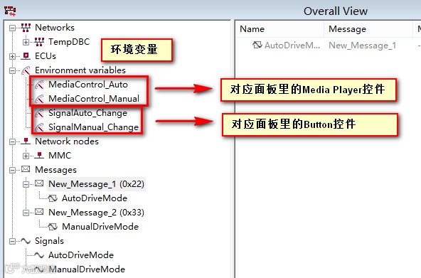 Step2:制作具有IL交互层属性的DBC(便于CANoe仿真),包含1个MMC节点,2条报文(包含相关驾驶模式信号),4个环境变量(关联面板控件,这里也可以使用系统变量,看个人使用习惯);