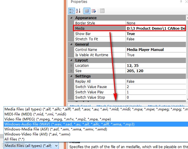 在Media Player控件的Media属性中加载音频文件,可以看到Media Player这个控件支持加载各种格式的音视频文件,非常强大。