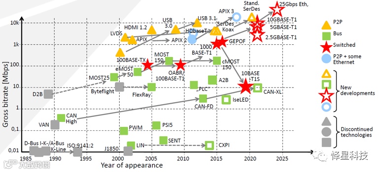 上图中我们可以看出车载通信速率以及通信方式的发展情况,尤其是在10Mbps通信速率,IEEE标准化了一个适用于汽车的10Mbps以太网版本(10BASE-T1S),发展千兆的1000BASE-T1的同时不忘10M的10BASE-T1S,IEEE的确有统一车载通信江湖的野心。但CiA(CAN inAutomation)联盟也不想轻易地被扫进历史课本,他们计划在今年的iCC(international CAN Conference,受疫情影响,会议时间已延迟至5月26日)正式发布支持10Mbps通信速率的CANXL。这两个标准在将来应用过程中必然会有一番龙争虎斗,后续的发展让我们拭目以待。