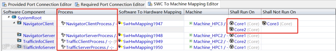 另外,在Adaptive AUTOSAR架构下,程序是动态运行的,Adaptive Application在其部署的Machine上运行时,都是操作系统(比如Linux)中的一个个Process(进程)。在进行软/硬件映射的设计时,可以定义每个process应该运行在的哪些core(核)上以及不能运行在哪些core上。