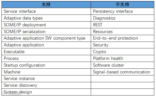下表显示了目前PREEvision中支持的Adaptive设计内容以及暂不支持的内容。