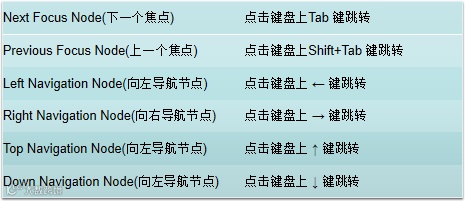 如何在焦点链中移动焦点呢?我们都知道键盘上有上下左右以及前进后退六个方向键,Kanzi Studio中也相应提供了以下六个属性来记录使用方向键后具有焦点的目标节点,属性与方向键的对应关系如下:
