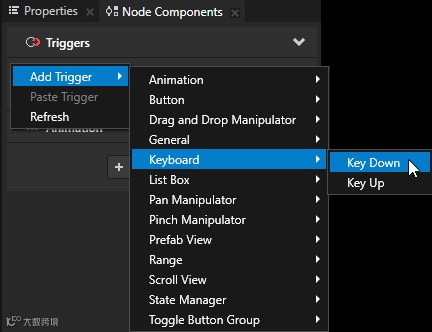 我们还可以使用键盘上的其他按键来移动焦点。例如,我们可以在按下键盘上的E键,转移焦点到某个指定的节点,这时候就可以为相应节点添加Key Down触发器,设置相关条件过滤按键是否为E键,当按下E键时,执行添加的Set Focus/ Move Focus动作,这样设置好后,当触发并满足条件时焦点就会移动到指定的节点。