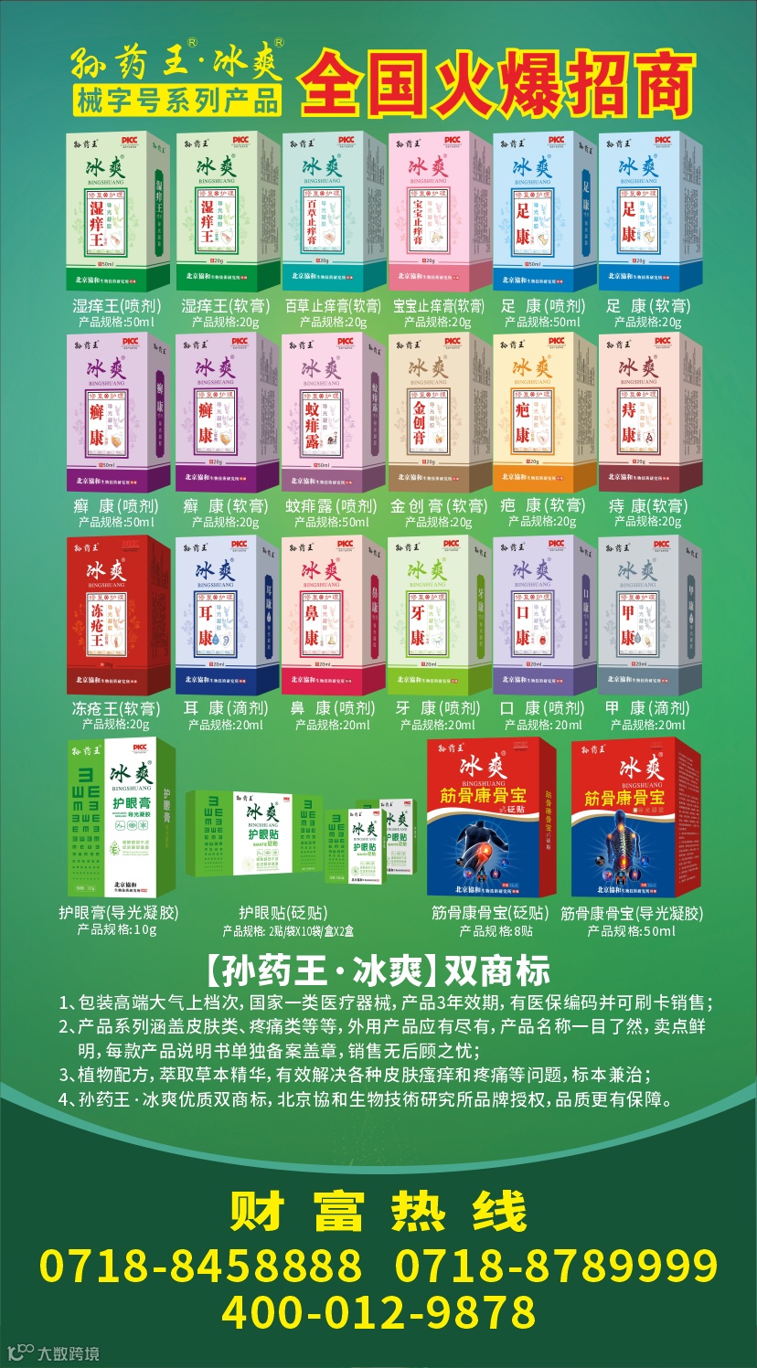 孙药王冰爽系列,纯中药提取物,无任何激素。针对各种原因引起的过敏、神经性皮炎、过敏性皮炎、日光性皮炎、湿疹、寻麻疹、红色丘疹、白色糠疹、头癣、体癣、手足癣、鹅掌风、甲癣、花斑癣、脱皮裂口、蚊虫叮咬、脚痒、烂脚丫、脚脱皮、脚气、灰指甲、冻伤、烫伤、鼻炎、耳炎、口腔溃疡、牙疼、眼部疲劳、疤痕、痔疮以及闭合性关节慢性疼痛等等,均有对应的产品,且有神奇的治疗效果。