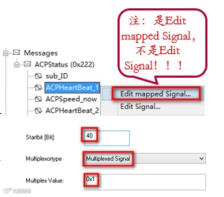 复用信号(Multiplexed Signal)编辑,Messages - 右键ACPHeartBeat_1 - Edit mapped Signal,编辑Startbit,设置多路复用类型为Multiplexed Signal,依赖的模式信号值为1,根据之前需求:ACPHeartBeat_1 对应 sub_ID =1,同理设置其它信号,编辑完成后,在Message视角查看模式信号和复用信号的从属关系