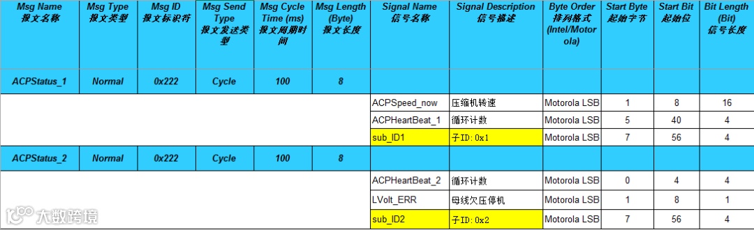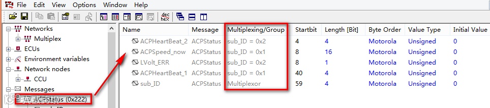 通信矩阵需求分析,如下图,ACPStatus(0x222)这条报文包含多路信号复用,模式信号( Multiplexor Signal ):sub_ID,复用信号( Multiplexed Signal ):ACPSpeed_now, ACPHeartBeat_1, ACPHeartBeat_2, LVolt_ERR ;当sub_ID =1时发送ACPSpeed_now& ACPHeartBeat_1; 当sub_ID =2时发送LVolt_ERR & ACPHeartBeat_2