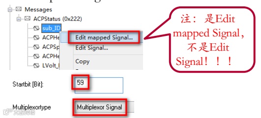 2. 对于Multiplexor Signal和Multiplexed Signal,除了使用Edit Signal编辑信号基本属性外,还需要使用Edit Mapped Signal来区分模式信号和复用信号,还有它们之间的映射关系;