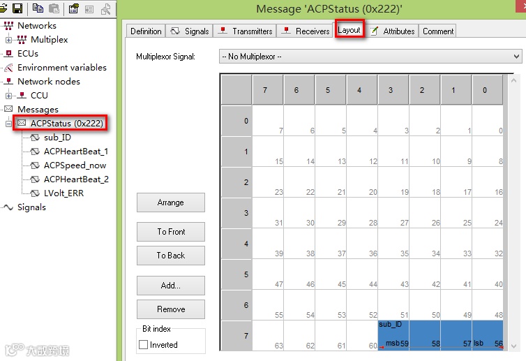 3. Message的Layout中只需要排布Multiplexor Signal就可以了,Multiplexed Signal的位置通过Start Bit来识别。
