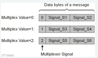 先了解一下多路信号复用(SignalMultiplexing)的概念,基于某个模式信号Multiplexor Signal(Mode Signal),报文中的某个区域(1个byte或多个byte)可以传输依赖于模式信号的多路复用信号Multiplexed Signal (Mode-Dependent Signal),如下图。当Multiplex Value = 0时传输信号S1和S2; 当Multiplex Value = 1时传输信号S3和S4; 当Multiplex Value= 2时传输信号S5和S6,可以看到当Multiplexor Signal改变时, Multiplexed Signal也相应地发生变化。