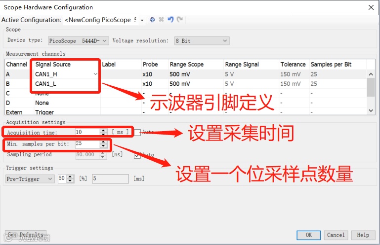 硬件连接好后我们需要在CANoe里对接入的Scope进行相关配置,首先我们打开CANoe,在Analysis功能区找到Scope按钮打开,然后根据我们实际连接的Scope型号进行参数的配置,主要需要配置的内容有示波器引脚的配置以及采样的时间和采样点的数量配置,为了使示波器的波形曲线更平滑,我们需要设置一个合适的每位采样点数量。