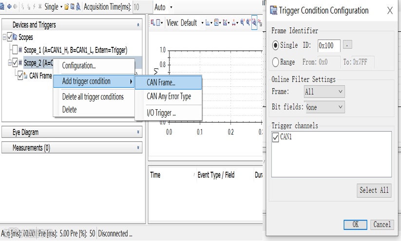 示波器参数配置好后,我们需要对示波器的采集进行配置,也就是设置我们的trigger条件,Scope有多种触发条件可选,包括帧触发、错误帧触发以及I/O触发。这里我们以帧触发为例来进行配置,在配置好的示波器参数上右击选择Add trigger condition,然后选CAN Frame就能进入帧触发配置窗口,如果选择报文触发,则填入目标报文ID即可。