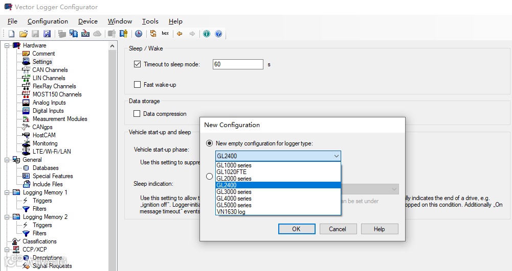 ▷ 打开Vector Logger Configurator,新建工程,选择对应设备型号并保存。