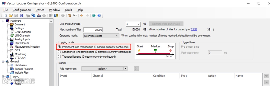 ▷ 选中Logging-Triggers,配置设备触发方式。(本文介绍Pemanent long term logging触发方式,即设备一直记录数据,直到总线无报文,进入休眠,总线有报文后随即唤醒并开始记录报文。)